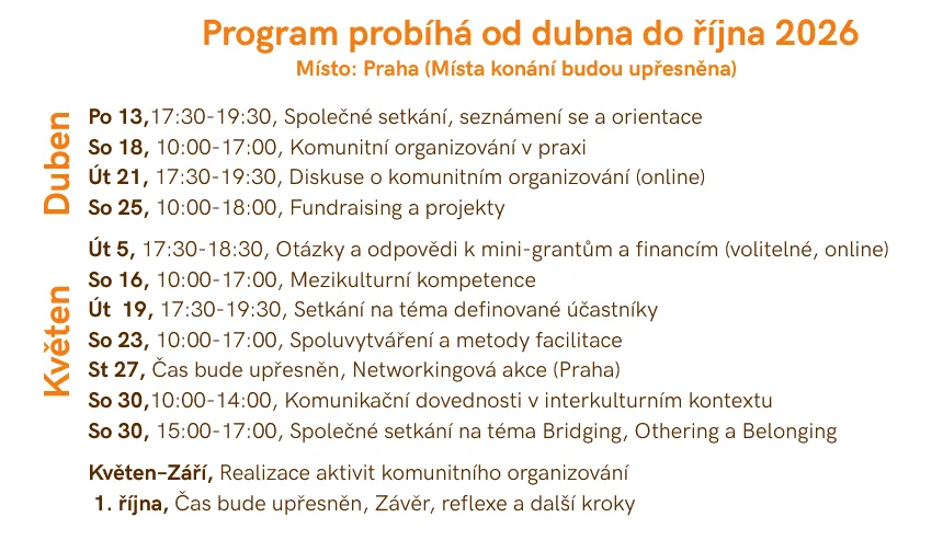 Pokud chcete posílit dopad svých aktivit, rozvinout své dovednosti a propojit se s dalšími aktivními lidmi v Praze, tento program je přesně pro vás. Zveme vás do našeho vzdělávacího programu — 40hodinového tréninku pro všechny, kteří chtějí prohloubit svou praxi jako komunitní organizátoři.