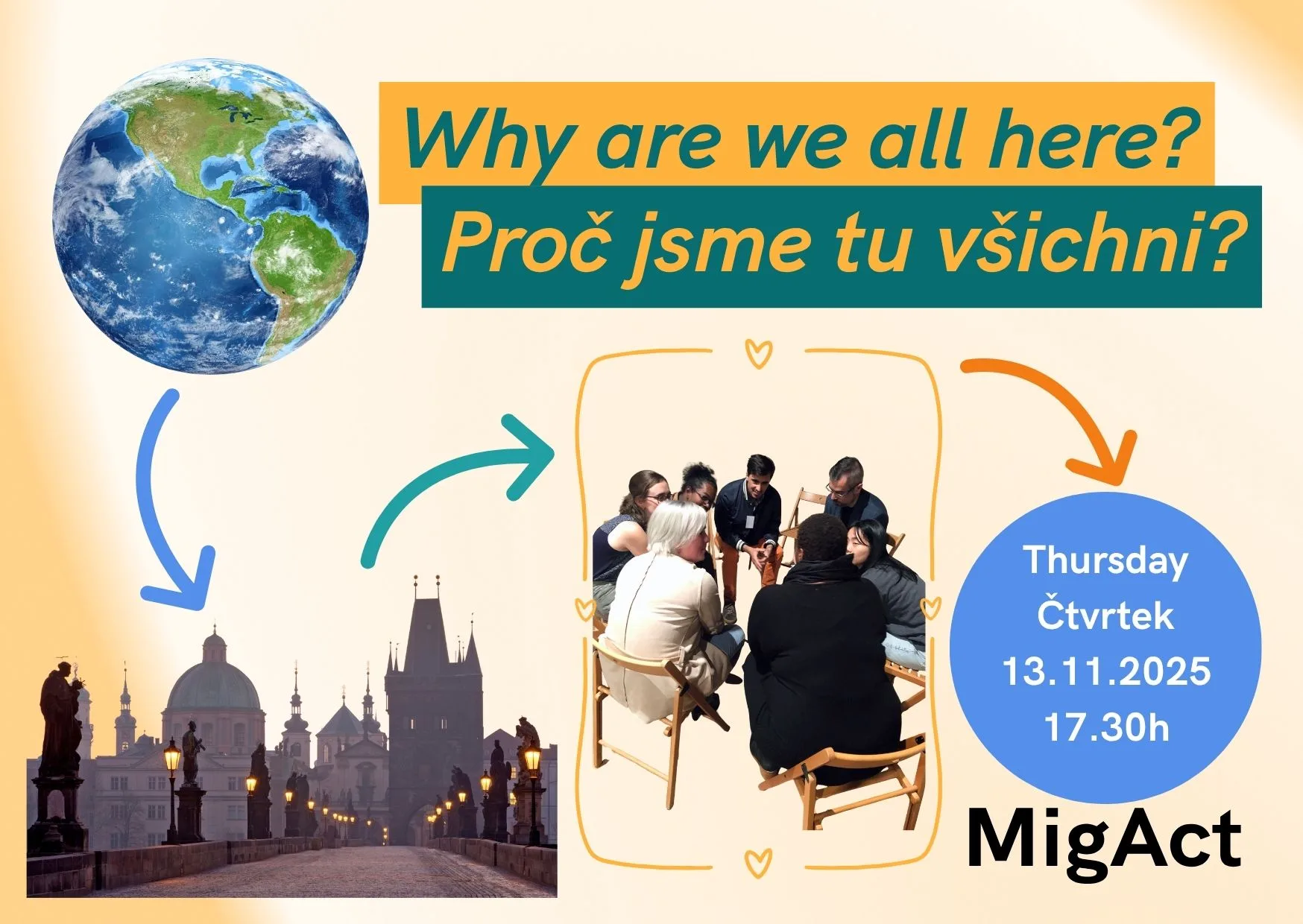 Whether you came to Prague by choice, chance, or curiosity, we all share moments of belonging, barriers, opportunities, and lucky coincidences. Let’s talk about them together and see what unites us — and what we can create next.